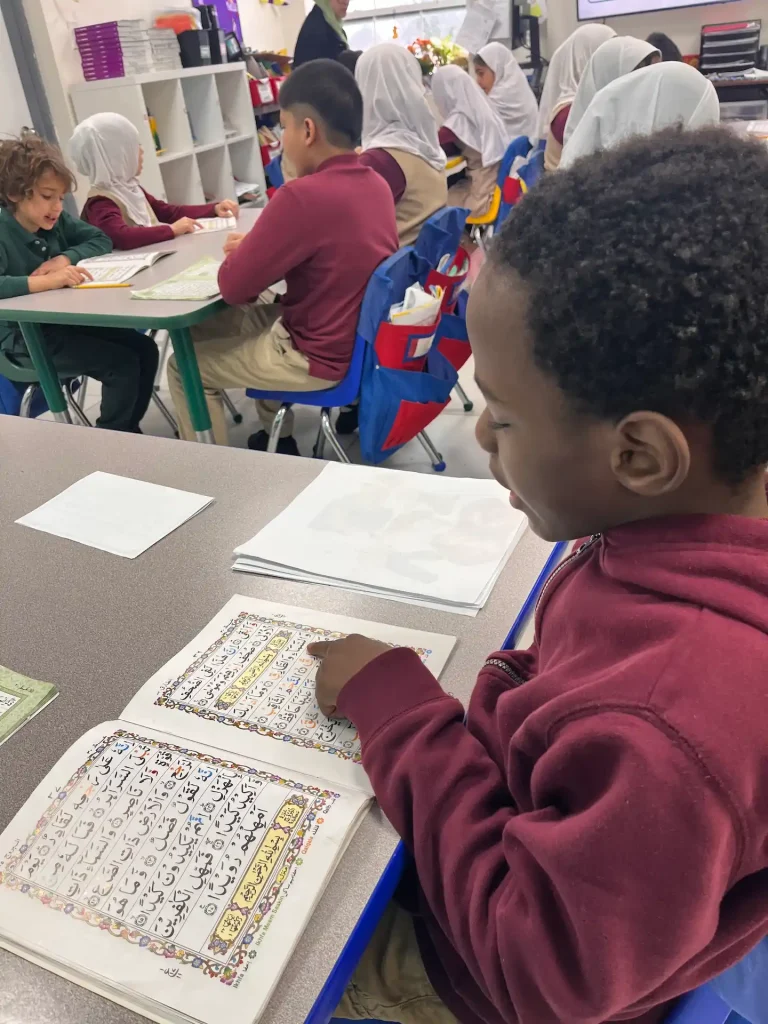 Cultural elements are woven into lessons to help students appreciate the richness of Arabic-speaking cultures and traditions. Students also learn basic Islamic vocabulary and terms to help them connect the language to their faith. Through consistent practice and immersion, students gain confidence in reading, writing, listening, and speaking. By the end of 5th grade, students are able to understand and use Arabic in a variety of simple conversational and academic contexts, preparing them for more advanced language learning in the upper grades.